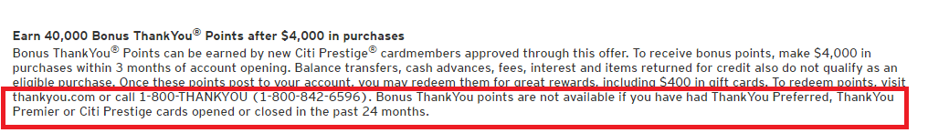 Prior to that, you could apply for the Citi Prestige and still apply for the Citi Premier two months after you’ve applied for the Citi Prestige. “Bonus ThankYou Points are not available if you have had Thank You Preferred, Thank You Premier, or Citi Prestige cards opened or closed in the past 24 months.”