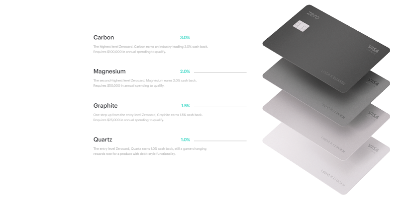ZeroCard’s most attractive feature is that it offers up to 3% cash back in an apparent tiered rewards style; in which, the rewards you earn is a direct determinant on how much you spend with your ZeroCard annually. this rewards to spend platform is similar to achieving elite status on a premium airlines or hotel card. The following threshold is as followed: